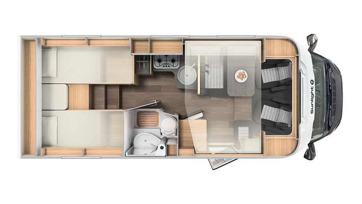 Es verfügt über eine eigene Heckgarage mit 2 Türen und 2 einzelne Längsbetten im Heck des Wohnmobils. Diese können zudem durch das mitgelieferte Polster zu einer 2x2m Liegefläche kombiniert werden und eignen sich besonders gut für gemütliche und erholsame Stunden zu zweit. Ein weiterer Vorteil ist im Sunlight T67S Wohnmobil das geräumige innovative Vario-Klapp-Bad. Im Sunlight T67S hast du WC und Dusche auf clevere Art und Weise vereint.