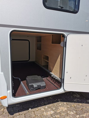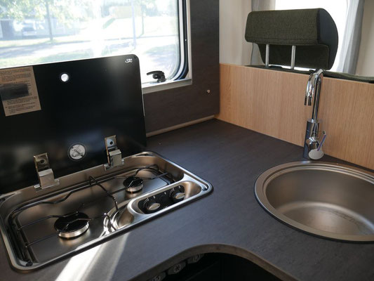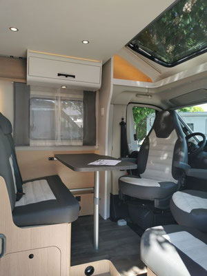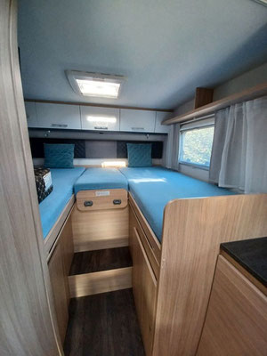 für 2-4 Erwachsene 2 Längsbetten im Heck umbaubar zur Liegewiese und Hubbett über der Sitzgruppe. Es gibt 4 Gurtplätze (2x Isofix)